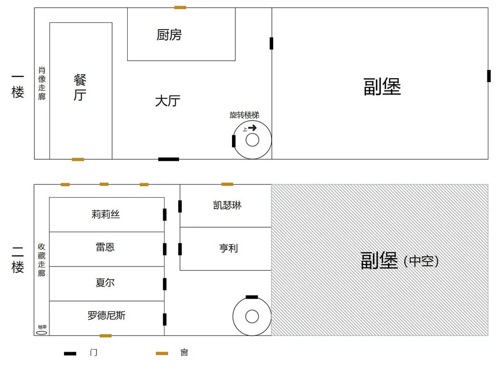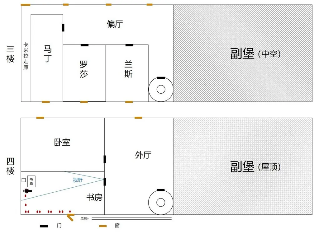 這個男人叫亨利,隸屬于皇家法院的執行人,相當于現在的律師。他們家世代為伯爵服務,當年他父親就是幫助羅伯特伯爵操辦了繼承一事,而現在輪到了亨利。 亨利的家族雖然沒有爵位,但他們博學多才、剛正不阿的特點頗受皇室的青睞,所以在上流社會里有著不俗的影響力。亨利工作的時候也完美繼承了這種風格,使得他年紀輕輕已小有名氣。大相徑庭的是,他為人放浪不羈。我也是利用這點接近了他,并以助手的身份一同前往風車堡。顯然,比起記憶各種繁雜的法律條文,不老的容顏才是我最大的武器。 當然,這段時間我也沒閑著,首先,亨利這個人跟霍華德家族沒有太多的瓜葛,基本可以排除嫌疑。其次,這次的遺囑宣讀儀式,伯爵的三個孩子都會到場。 長子馬丁吊兒郎當,貴族圈子里的花花公子,仗著自己外公的實力亂搞男女關系,雖還沒娶妻,但外面已經有好幾個私生子。 次子蘭斯,伯爵的重點培養對象,跟他父親年輕的時候一樣常年在外游歷學習,長得英俊且品行端正,有不少領主都已經向他拋出橄欖枝,想把女兒嫁給他。 蘭斯的雙胞胎姐姐羅莎長年跟父親一起生活,這個年紀還未結婚在那個年代就已經能稱為大齡剩女了,只聽聞好幾次都是因為她以死相逼所以取消了婚約,不過這種情況在當時也很常見,特別是那些注重教育的家族,已經出現了相當多的獨立女性。 至于伯爵有沒有私生子就不得而知了,但最近是聽到一些關于這方面的流言蜚語。 風車堡位于蘇格蘭高地的邊上,我倆乘坐馬車穿過幽長的峽谷,谷口處是一座小山丘,風車堡就坐落在山丘上。風車堡占地面積不算大,對比其他同等級爵士的古堡也不算宏偉,唯一特別的就是架在建筑正中間不停旋轉的風車,風車大概占整座城堡二分一的高度。亨利提醒我待會下車的時候要多加小心,他第一次來的時候因為沒站穩還摔了一跤,極其狼狽。風穿過峽谷匯聚于此,城堡正面的風會非常大,也正因為如此,一年四季都能為風車提供足夠的動力。 “凱瑟琳,來。”我扶著亨利遞過來的手,裝作有點害怕,小心翼翼地下了車。事實上常識告訴我,以現在風車的轉速,風并不會太大,我腿上輕輕飄動的長裙也證實著這一點。 來迎接我們的是管家雷恩大叔,一個身材高大的頭發花白老頭子。他看見到來的是亨利,立馬迎上前來,熱情地跟我們打招呼。亨利給我介紹,雷恩侍奉伯爵很久了,所以他很小的時候就認識雷恩叔。接著他介紹我說我第一次來,順理成章讓雷恩領我們參觀。 風車堡采用的是非對稱的設計,主堡在左,副的在右,主體部分都是長方體。副堡其實是個高十幾米中空的巨大農場,豬牛羊、雞鴨鵝、信鴿馬匹應有盡有。風車可以通過轉軸給農場的“機器”提供動力,所以只需要洛坦先生一個人就可以照顧好這里。亨利似乎不太喜歡這里的環境,我們站在一樓主堡跟副堡相連的門外看了幾眼便回頭了。 主堡是我們主要的活動空間,這里跟其他貴族城堡一樣,裝修得金碧輝煌,價值連城的裝飾品隨處可見。這里每層樓都至少有5米的高度,一樓更是高達7米,當然這些都是我通過數梯級估算的,利用高低差來完成手法對于古堡殺人事件來說是極為常見的。 一樓是客廳、飯廳和一些給大家提供的活動空間。管家雷恩和女仆莉莉絲住在2樓,這層還有一些客房,也就是我們住的地方。三樓則被幾位繼承人瓜分了。再上一層就是頂樓了,那里的空間完全屬于羅伯特伯爵。此外一樓下面還挖了一層地窖。 連接這五層樓的是位于角落的旋轉樓梯,從視覺上來看,應該是位于風車正下方。樓梯由里外兩根木質圓柱組成,形成了一個相對密閉的空間,兩個圓柱之間便是梯級,在外面看起來就是一個大圓柱子,外側還雕著各種花紋,光看精細程度便知是出自大師之手。梯級盤著內柱順時針向上,梯道內十分寬敞,足夠兩人并排行走,雖然有窗但光線還是不足,所幸樓梯內部還鑲著及腰的扶手。 第一次走這樣的樓梯對我來說頗有難度,我挽著亨利緩慢前行,也正好順便數了數梯級以及旋轉角度。外柱每層樓都有向外打開的門,但門卻不是一個朝向的。一樓的門是靠近大門一側,其他樓層都是靠近副堡那側。認真想一想也就覺得不奇怪了,從體感上,每級樓梯旋轉的角度差不多,一樓比較高,上二樓的話,轉了兩圈后還得比其他樓層多轉接近四分一。 “雷恩叔,這條走廊是通往哪里的?”我指著一條盡頭閃爍著微光的走廊問道。 “哦,差點忘記帶你參觀了,那里是老爺特意在一二三樓留的一塊地方,說是用來收藏他自己的記憶。” 老先生點起了蠟燭帶我們前行,拐過一個彎以后,走廊變得更暗了,我不由自主地尖叫了一聲,把亨利的手臂卷得更緊了。當然也是假裝的,老娘什么妖魔鬼怪沒見過。借助微弱的燈光可以看到,這條走廊的兩側掛著各種肖像畫,以及畫下面還標注了年份。亨利接過雷恩叔的話給我介紹,這是誰,這又是第幾代伯爵,他們有著怎樣的“豐功偉績”,其中還給我重點介紹了兩位女伯爵,其中就有羅伯特伯爵的奶奶。而前一代伯爵的畫像掛在最末端,它要比其他畫像都大一些,也就是他所在的古堡被燒毀了,所以現在我們看到的這些畫像都是羅伯特伯爵找人根據他的記憶重新畫的。 我內心嘀咕著,能設計這種昏暗的樓梯和展示走廊,羅伯特伯爵肯定是個陰郁的人,搞不好是個雙子座。 二樓也在同一個位置有這樣一條走廊,不同的是,兩側都是一